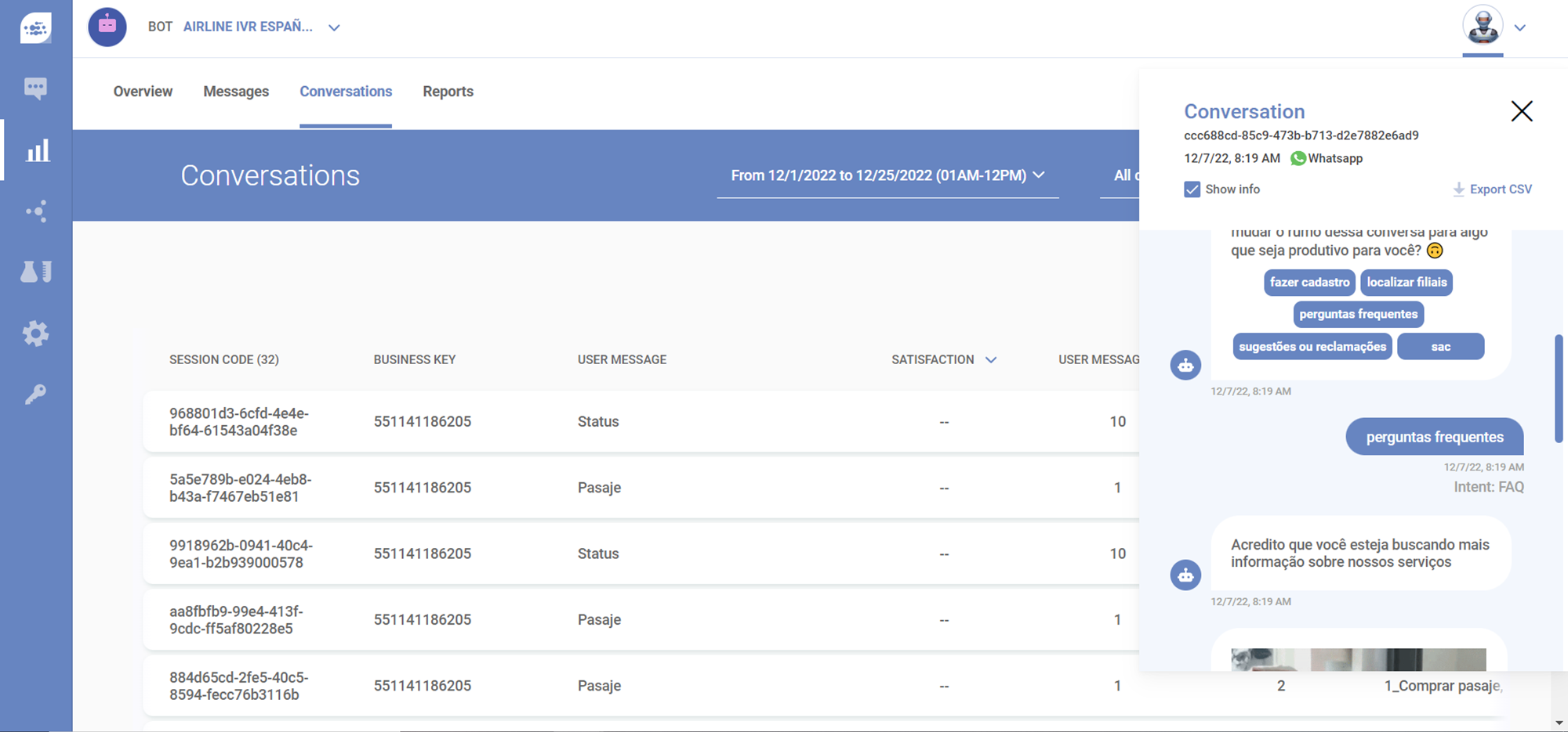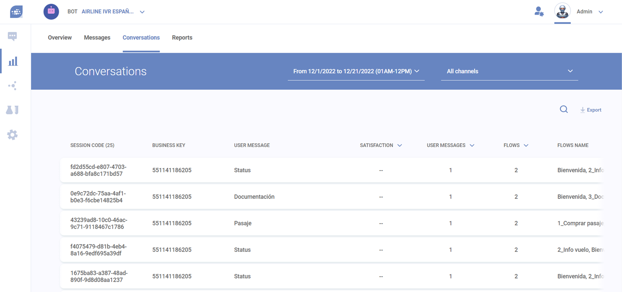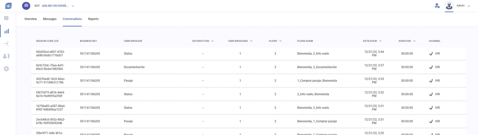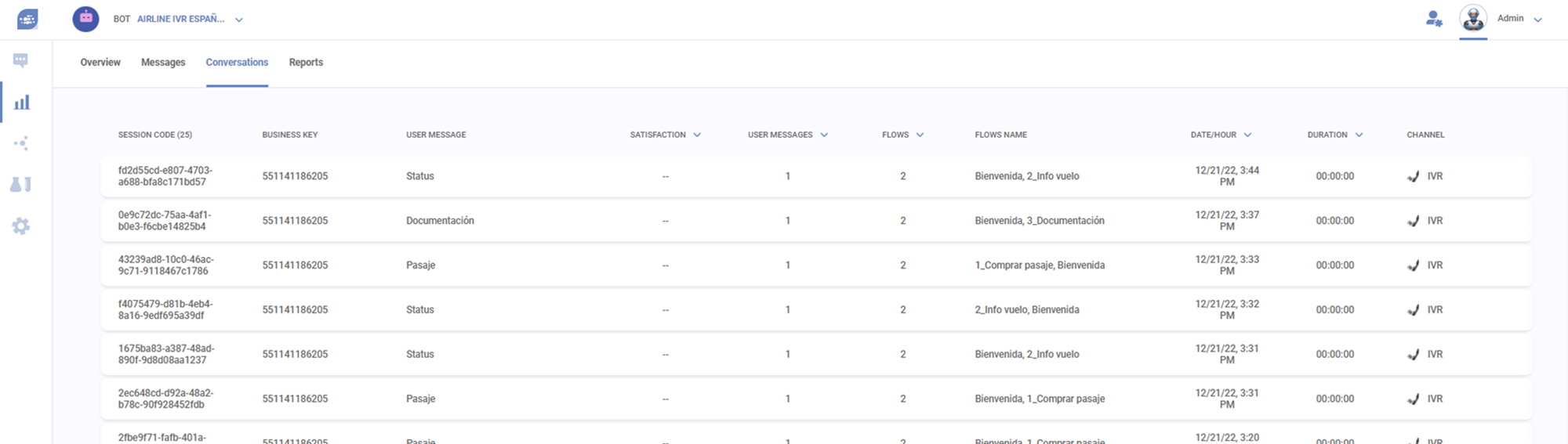 The Conversations Dashboard is a detailed way of analyzing the conversations. You will be able to understand the satisfaction score, which flows users went through, channel, duration, etc.