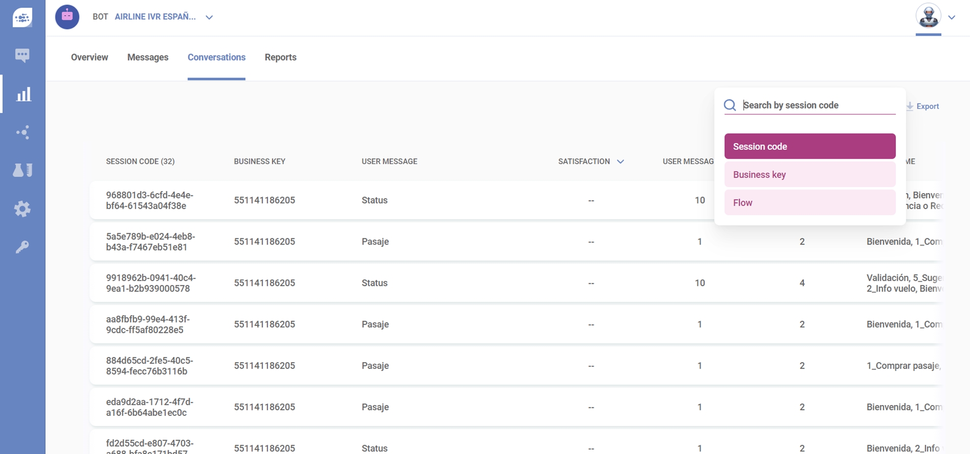 You can refine your data visualization through the Search bar. Conversations can be filtered by session code, business key and name of the flow.