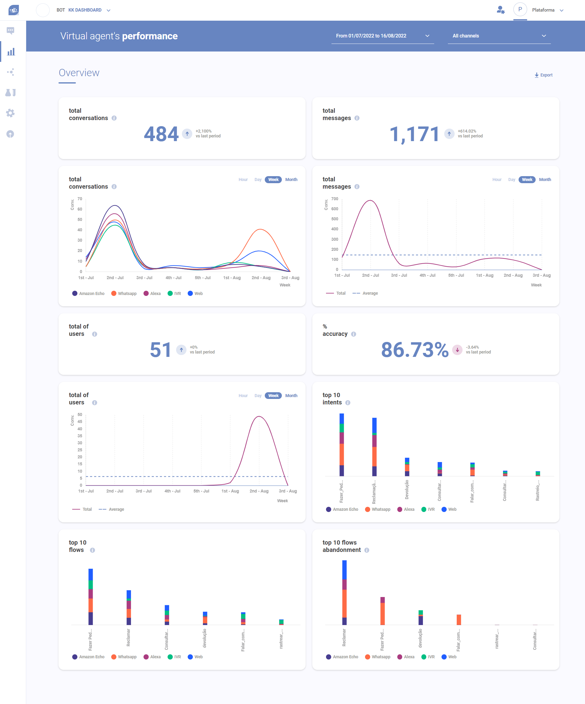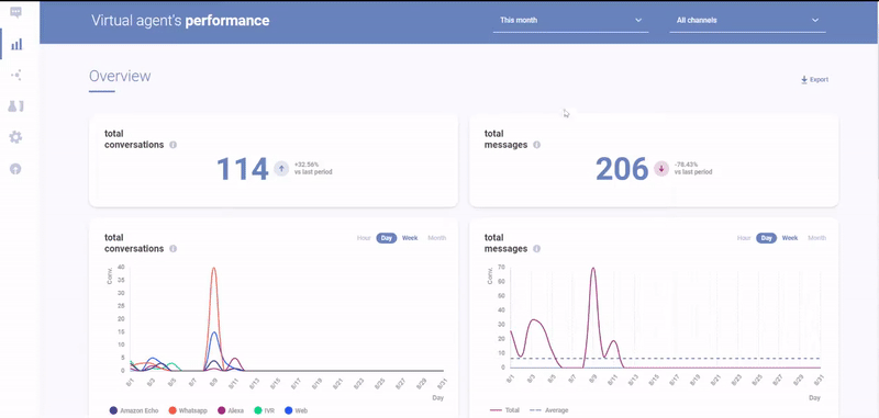 The number of sessions between the virtual agent and the user in a time frame. For this KPI, it will be displayed the total number, its percentage change when compared with a previous period and how it oscillates by hour, day, week, or month in every channel.