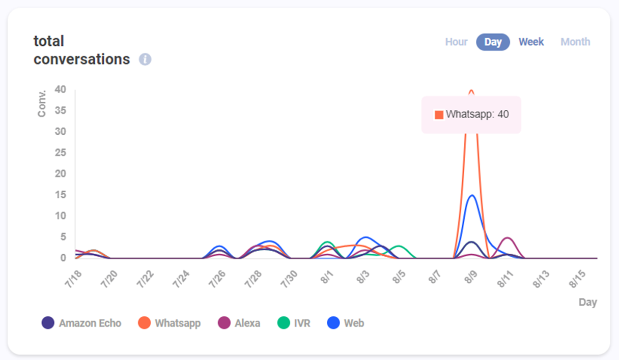 The total conversations, total messages and total of users will also be shown as a line chart. When hovering the lines, you can see more details like the number of conversations in each channel.