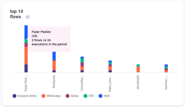 The metrics for the top 10 (intent and flows) will also be shown as bar charts. By hovering over the bars, you’ll see the specifics, such as their occurrences by channel and the total executions during the period.