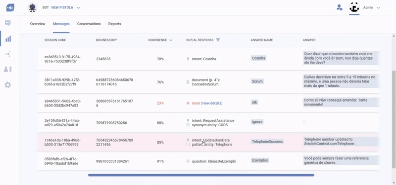 The User messages section in Dashboards will provide you a more detailed analysis of the virtual agent performance. This section shows information about the conversation, its confidence score, how and what was the NLP response to each user input.