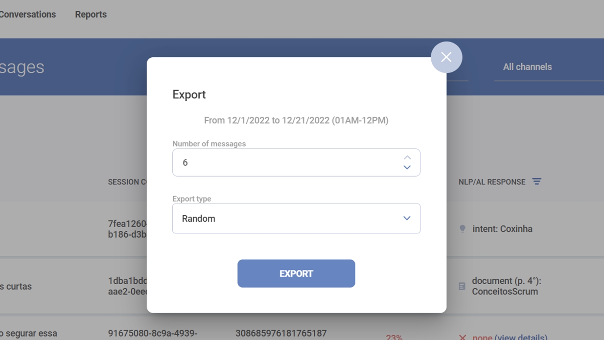 You will also find an option to export a report from the conversations at the top of the detailed conversation window, by simply clicking a button. In that instance, you won't apply the current filters, but instead, download all of the messages of that given conversation.
