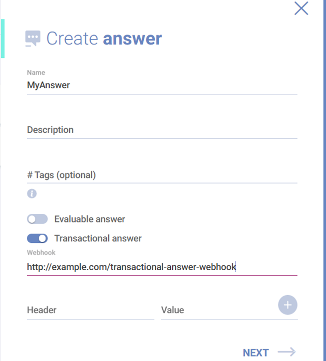 In the Cockpit, when creating an answer, there is an option to mark the answer as “transactional”. If this option is checked, the webhook field appears. Enabling this options means that this answer has dynamic content that must replaced by the webhook.