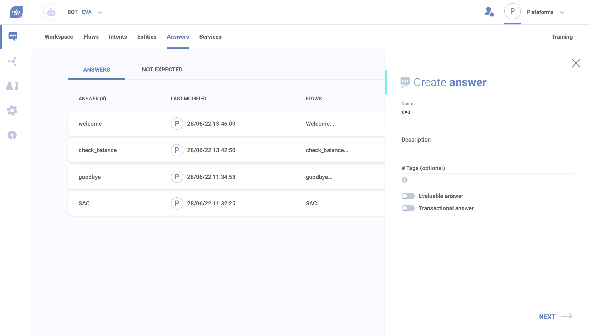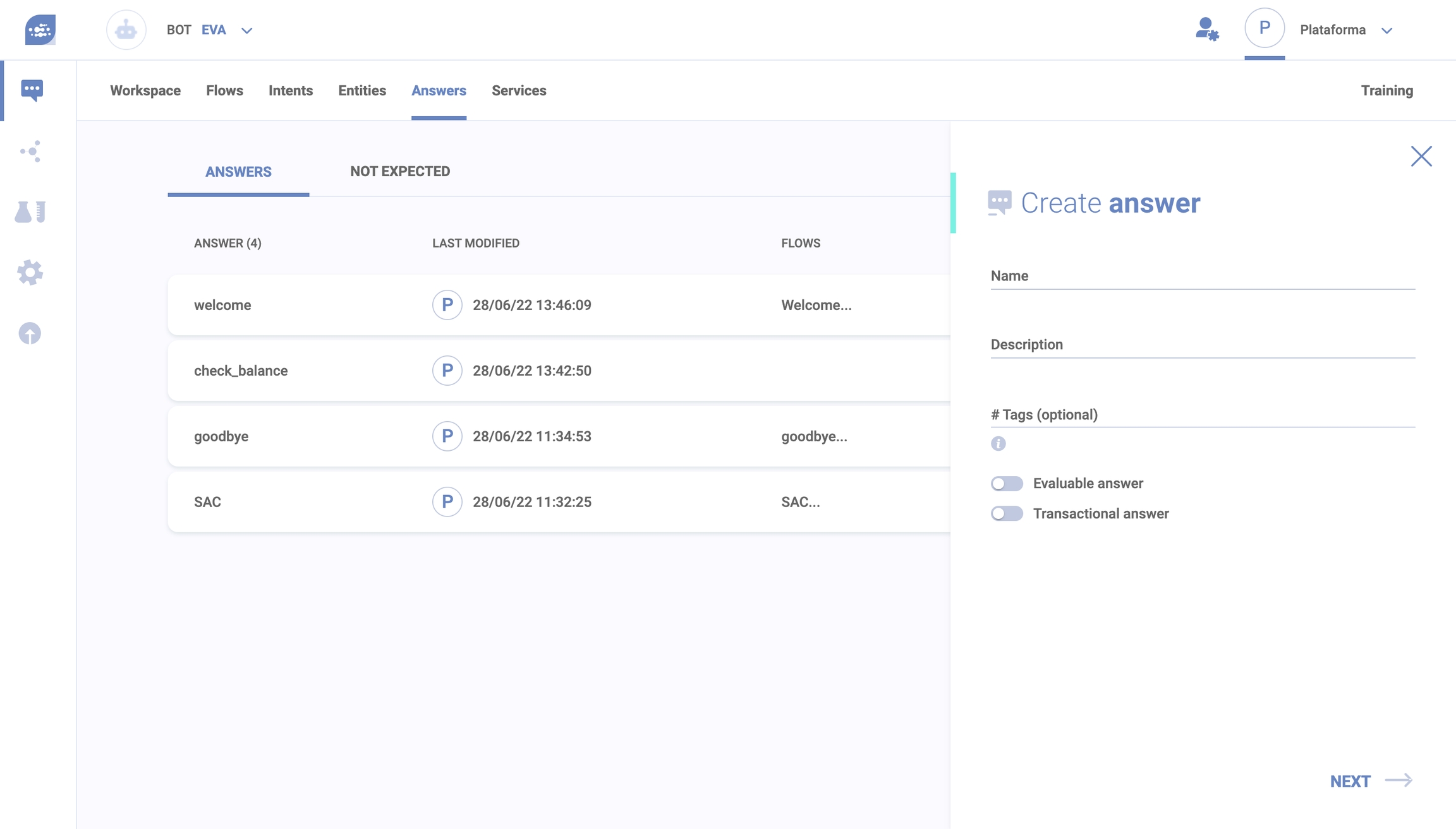 Important: Through FAQs, you do not need to build a simple flow, with an Intent and its Answer. Simply by registering an Answer that has exactly the same name as an Intent, the NLP will automatically identify the user interaction and lead to the correct answer. 😎