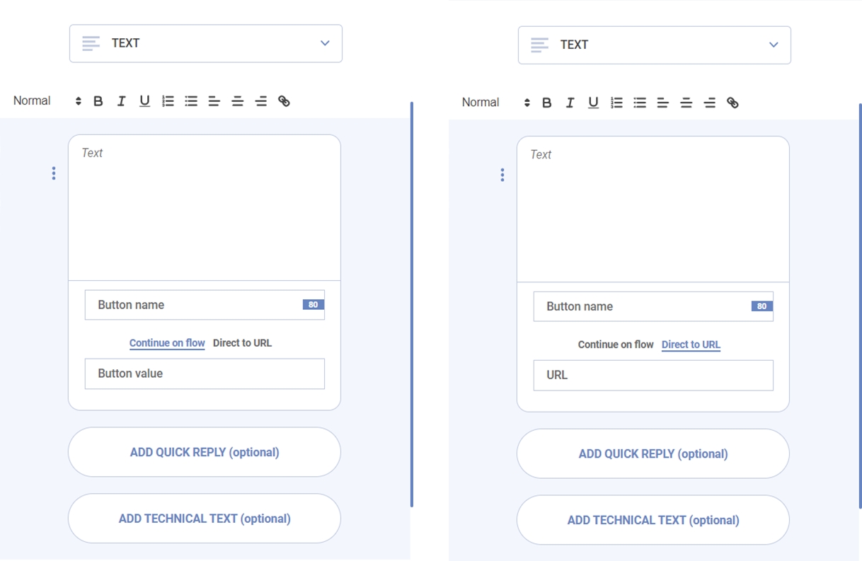There is another text template that appears when you specify a channel. Depending on the chosen channel, you can add buttons by enabling the quick reply option. You can also insert a technical text if the selected channel supports it.