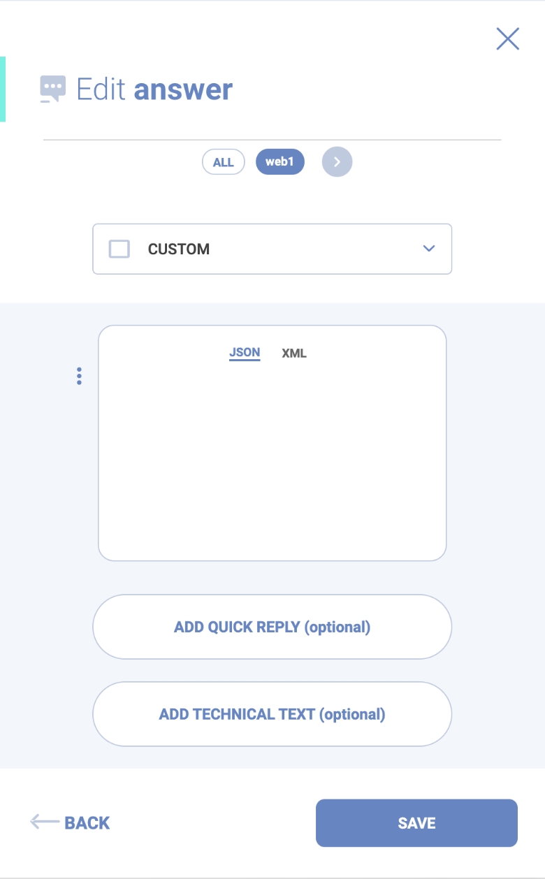 You can create answers that work for multiple channels. For each channel, Syntphony CAI also offers templates so you can build answers according to the models. You can build your answer template and insert as a JSON in the custom option. Its template, aesthetics and functionalities will have to follow all the rules of the selected channel.