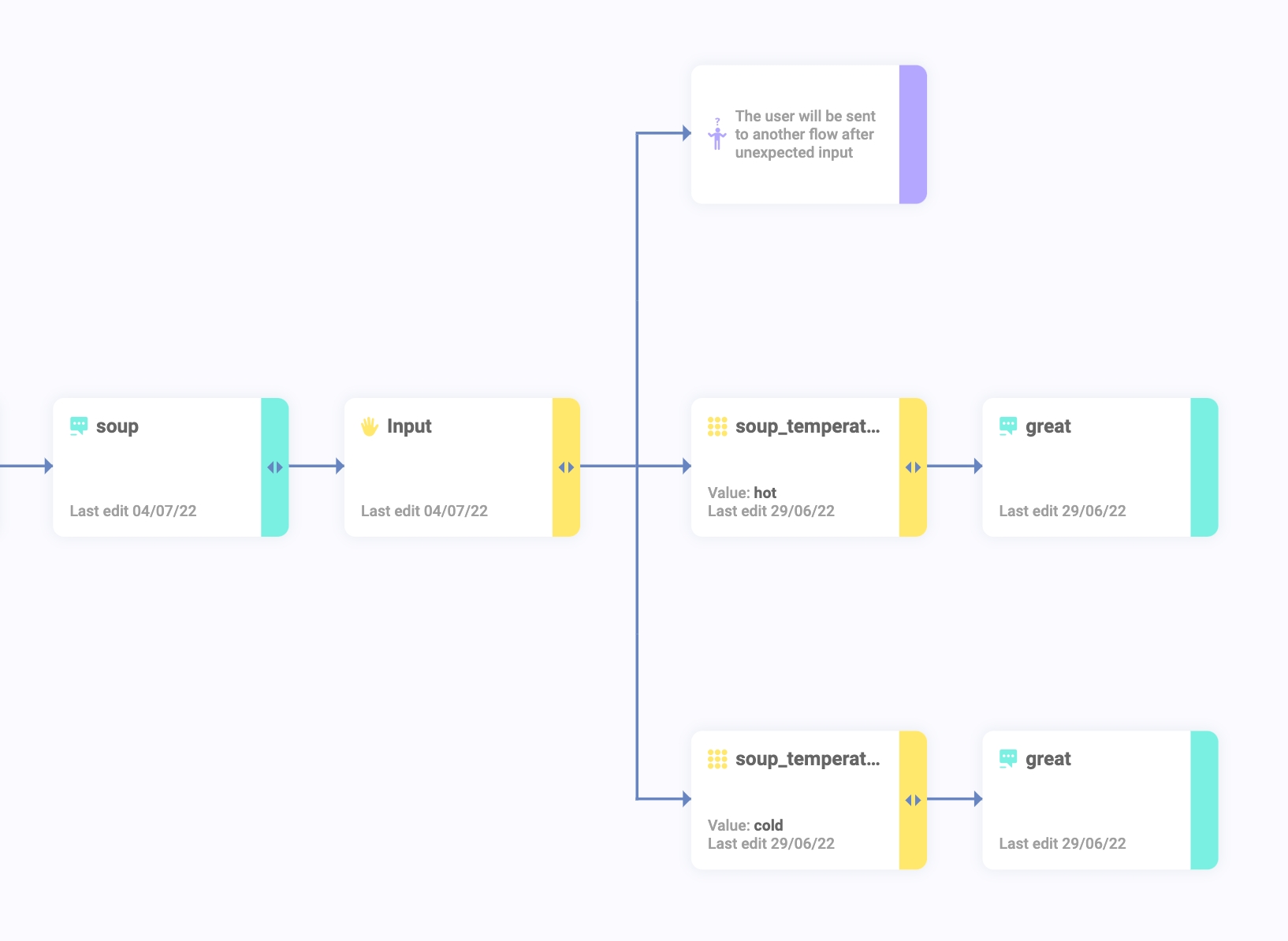 But the user might give an answer different from the two options available, like “I’m not sure” or "I don't know...". If you don’t want the Not Expected answer to be delivered just yet and want to offer a third option as an alternative flow instead (directing them to an Advanced Support flow, for example), follow these steps: