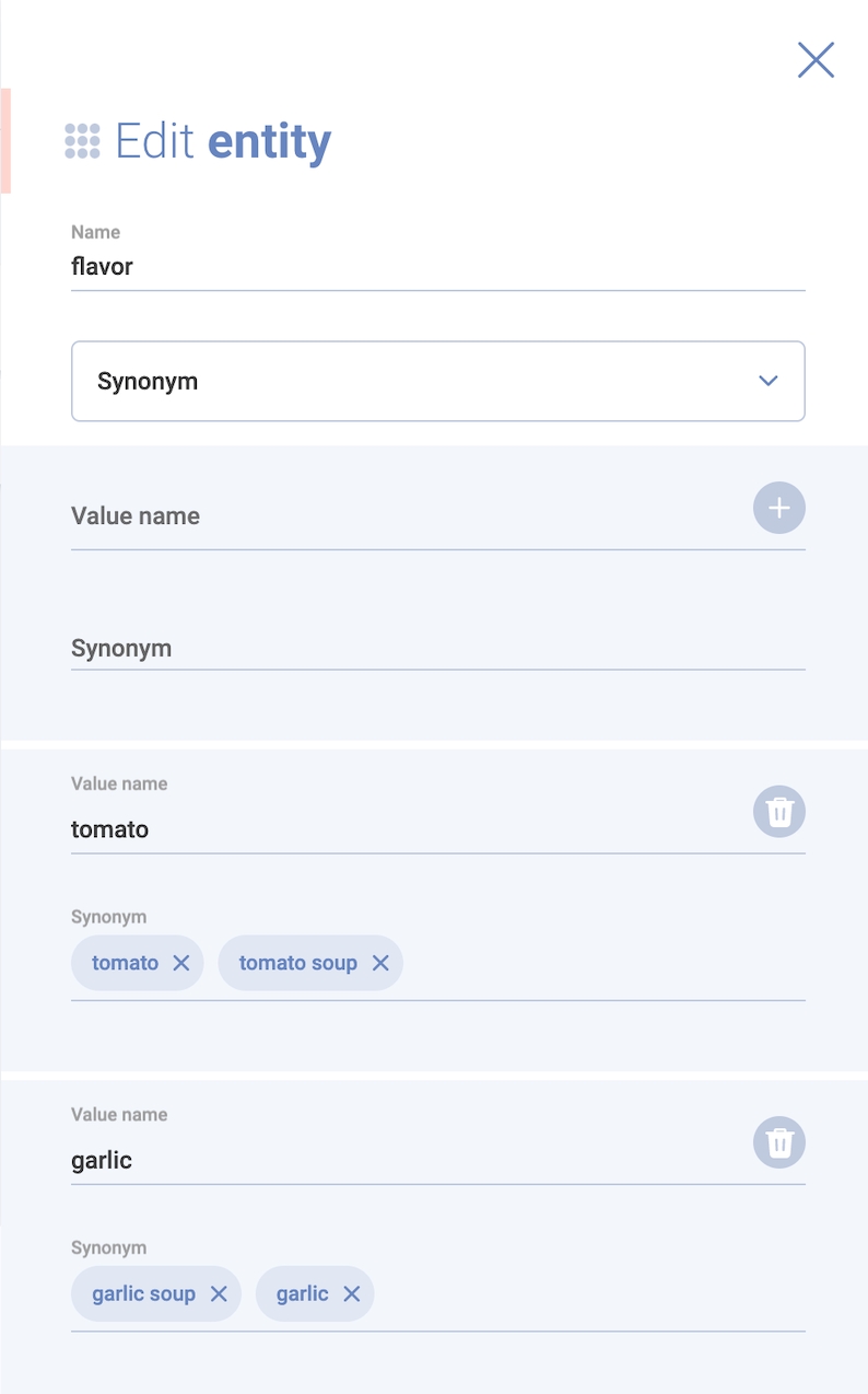 For example, you can name a button “order tomato soup” and insert “tomatosoup” as a value, and then add an intent with an example named “tomatosoup”. You can also add an entity with “tomatosoup” as a value.
