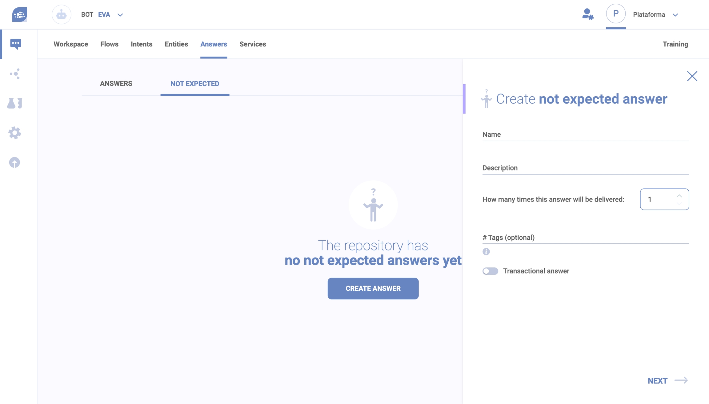 Not expected answers are fallback answers delivered when the virtual agent doesn’t understand the user’s question. They are added automatically when the a interaction is demanded to handle content that are not part of your virtual agent's knowledge base.