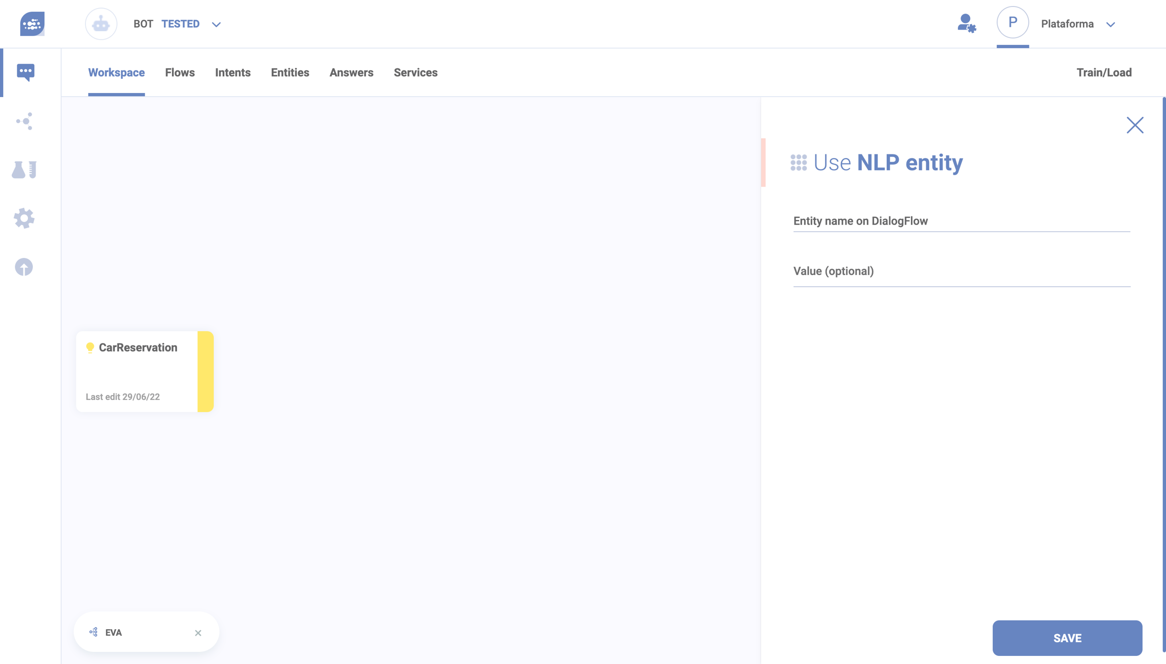 On the value field, you can either enter a specific value from the NLP or you can leave it blank to consider all entity values registered. If you want to use a specific value, you have to insert its name exactly as it is written in the NLP.