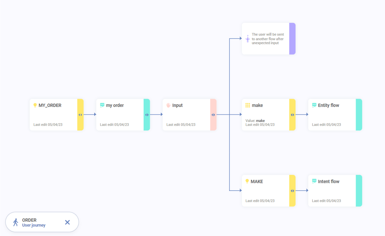 In this very specific case, when the NLP recognizes the Intent and the Entity in the same interaction, Syntphony CAI prioritizes the order of construction of the flow, from top to bottom.