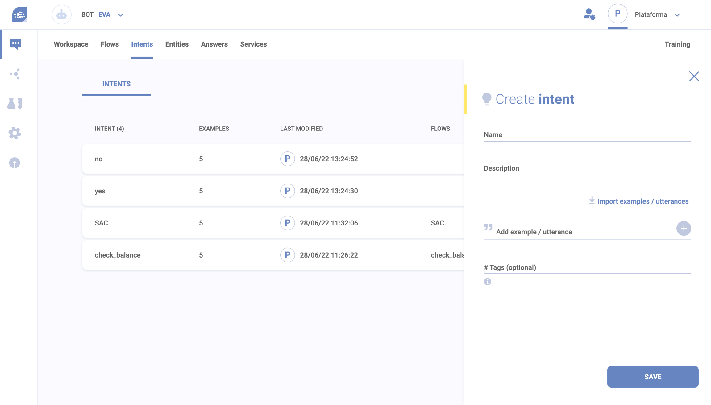 Before giving the name of the Intent and register your Utterances (always remembering that Utterance is a sentence/phrase that indicates the Intent of an user), you click the button “Save”. And that’s it!