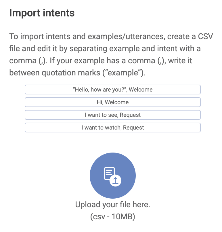 You might have a lot of Intents or examples/utterances. To save the work of registering each one individually, Syntphony CAI allows you to upload those intents and examples/utterances in one file.