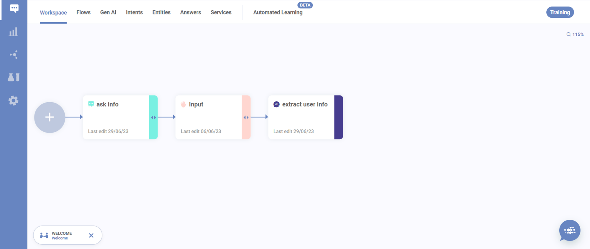 First thing to note is that this flow is rather short. It makes use of a loop with a jump cell. The core idea here is as follows: We start the flow by collecting informations from the input that brought the user here. We then parse it, and use a Rule Cell to verify if all fields have been filled. If they haven't, we prompt them to fill in the missing fields, and open an Wait Input Cell, before a jump that will set the user back to the beggining this flow.
