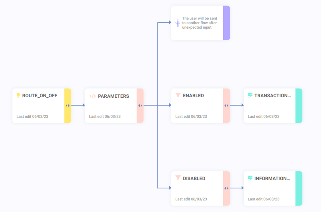 hiddenContext.yourVariable = true;See in the image below how the flow was built to branch between a path for a transactional or an informational flow. In this scenario it was used (true) to enable the transactional flow and (false) to disable it: