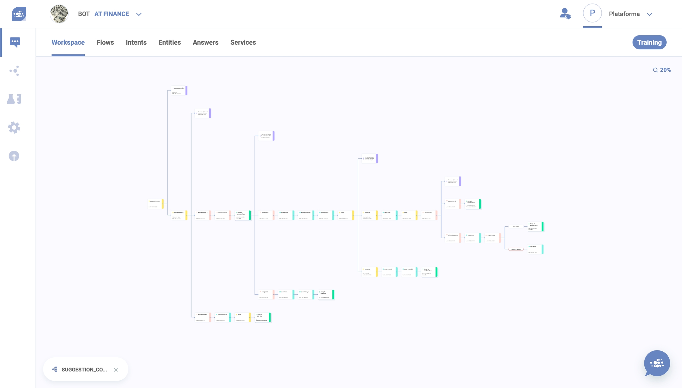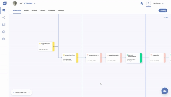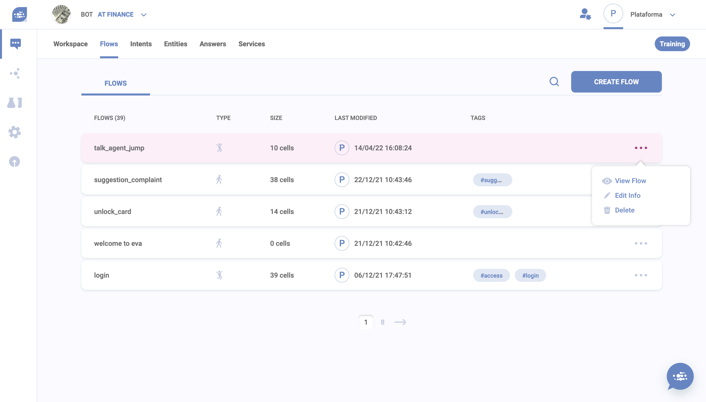 The sequences of cells inside the Workspace are called conversational flows. They're part of your virtual agent's knowledge base. Before building your flow, it's important to learn about all the components that are part of the dialog.
