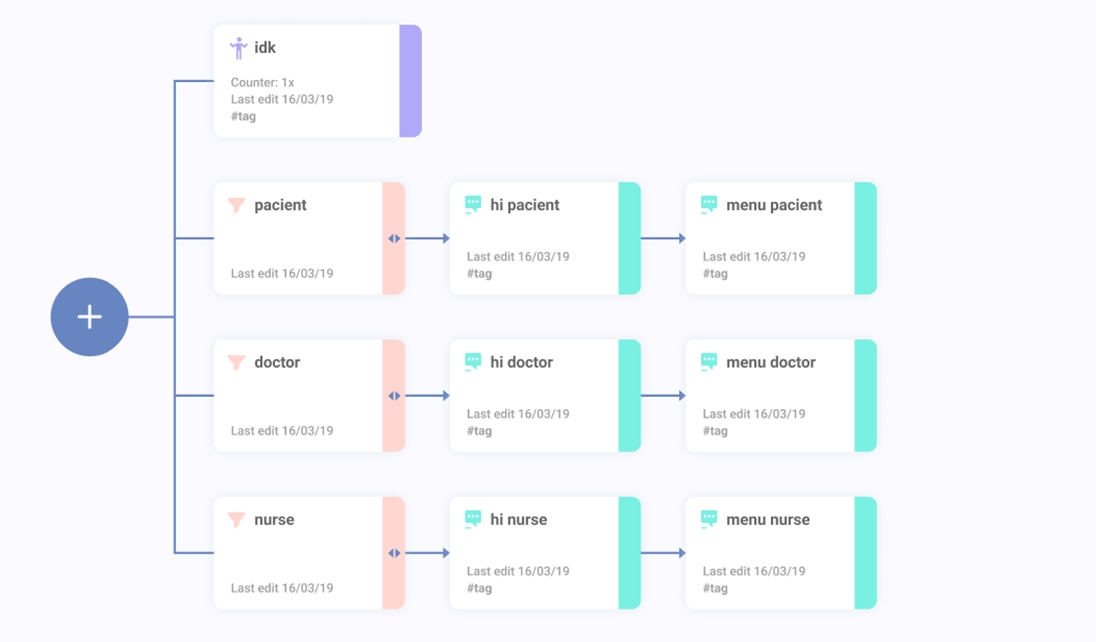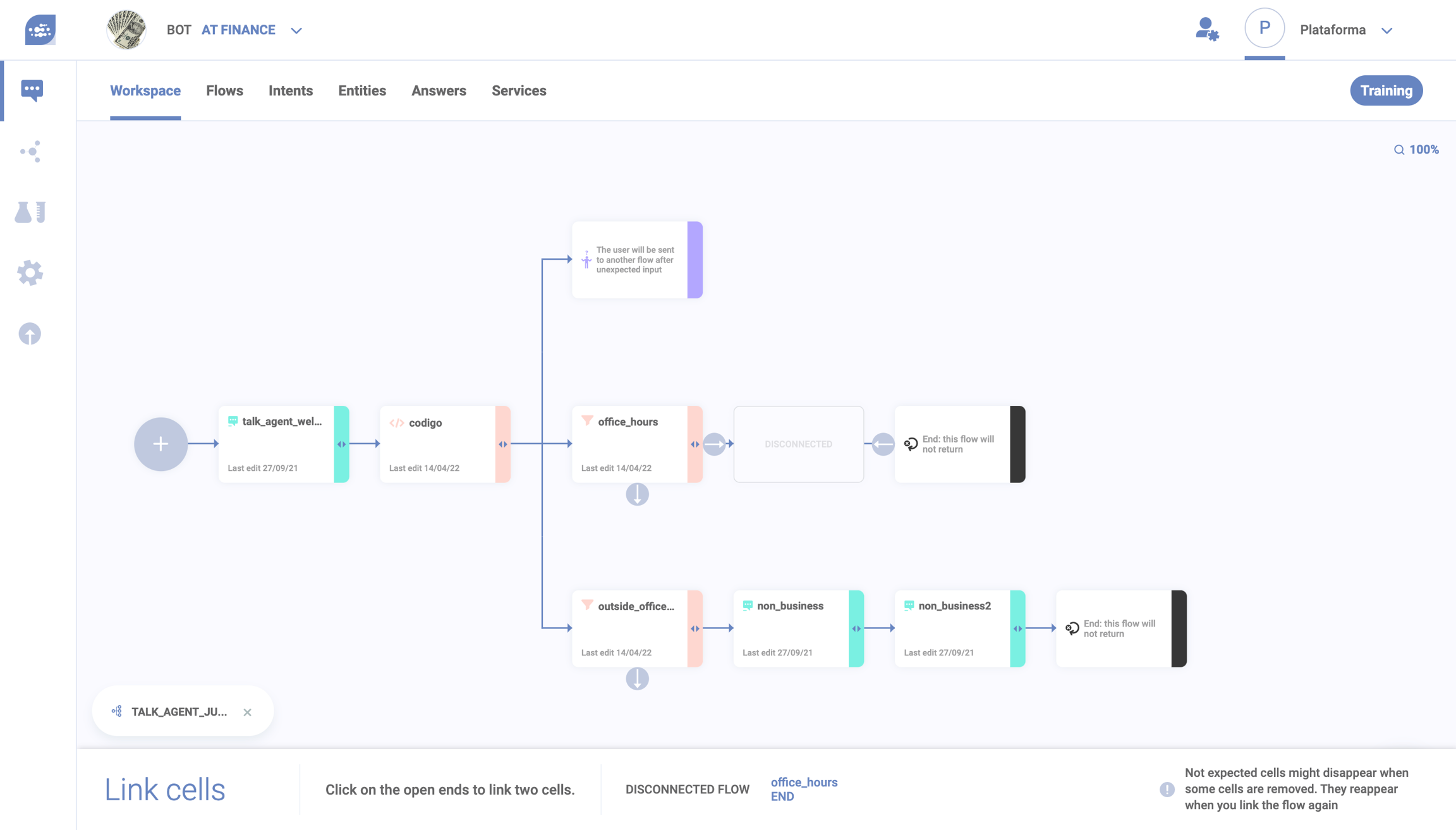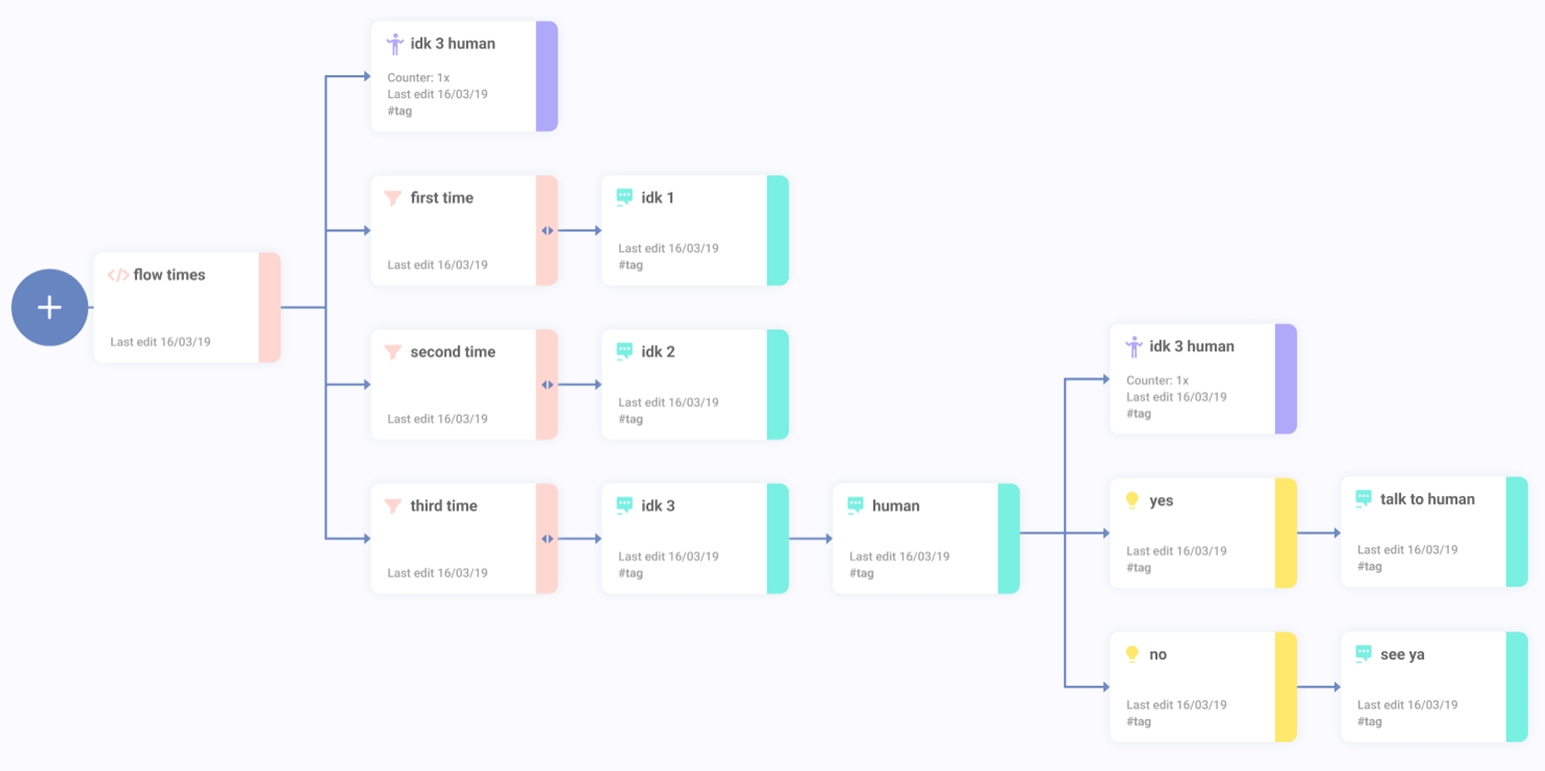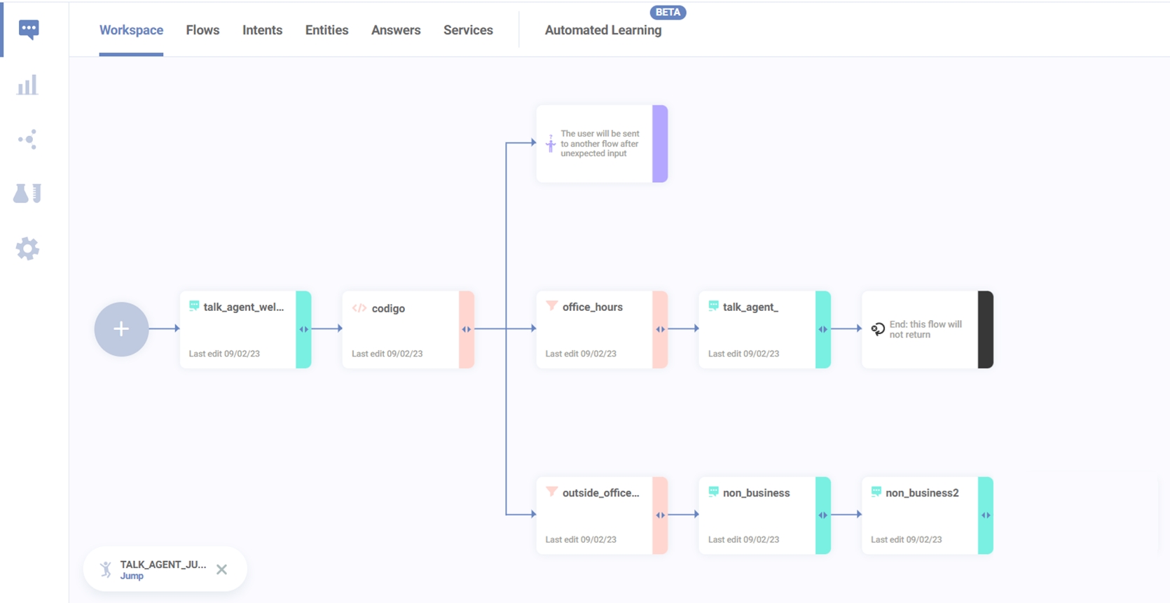 Example: In the image below, we used a Code and Rule cells to disambiguate the flow when users try to reach for a human assistance during business hour and after that.