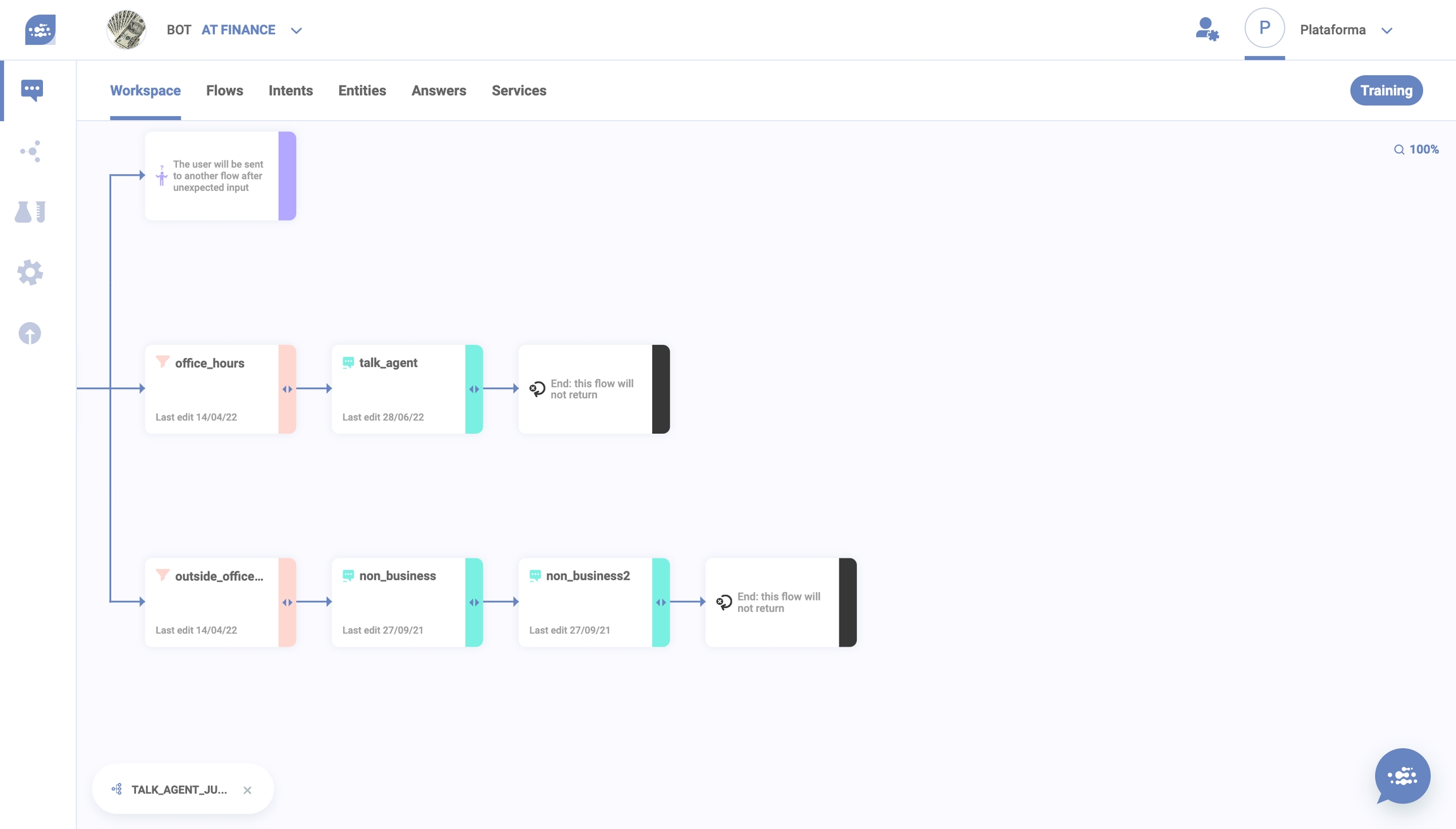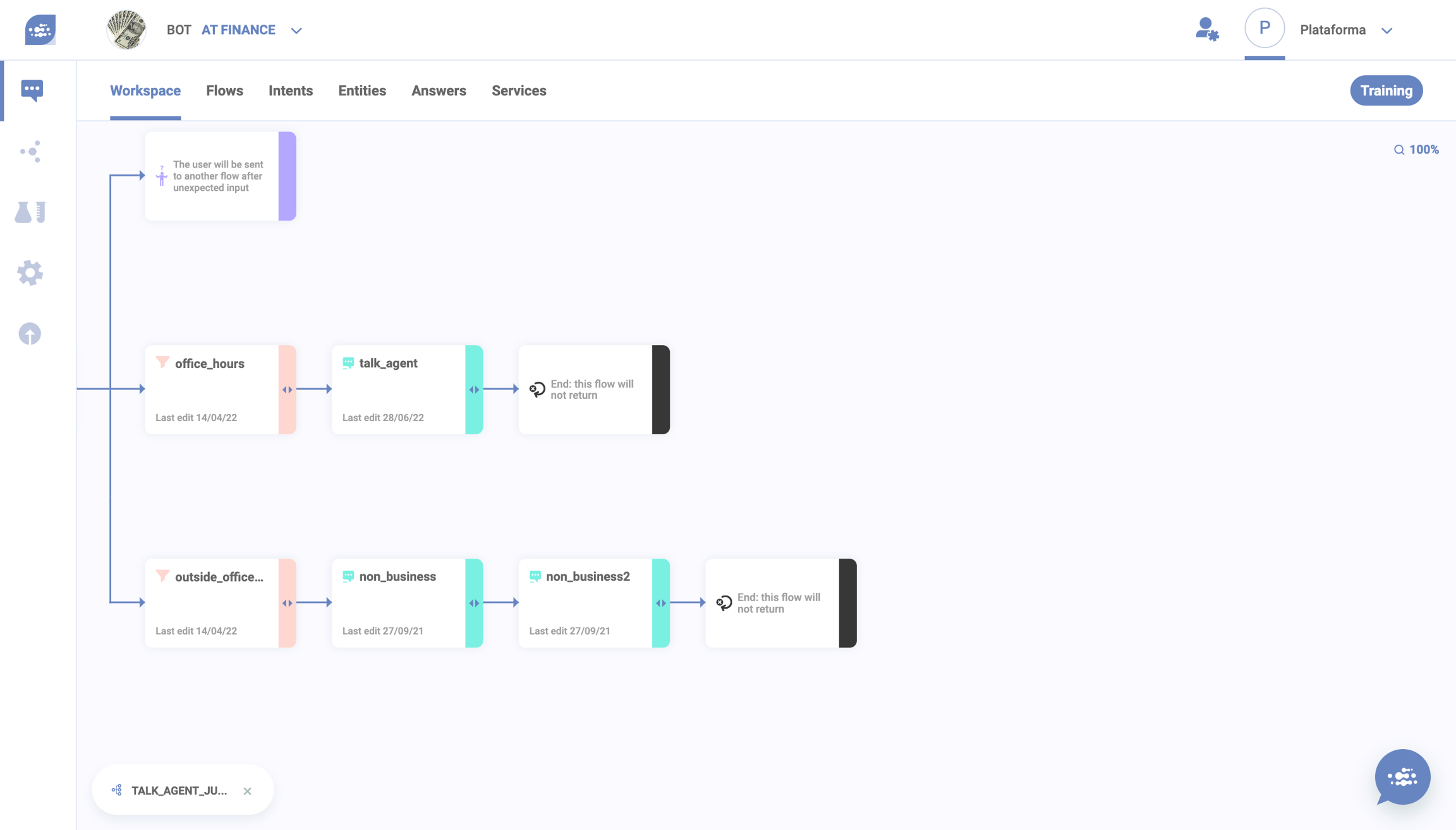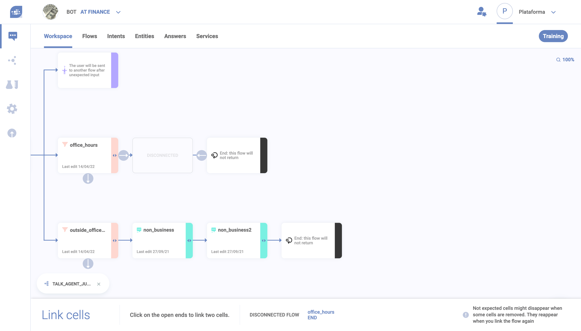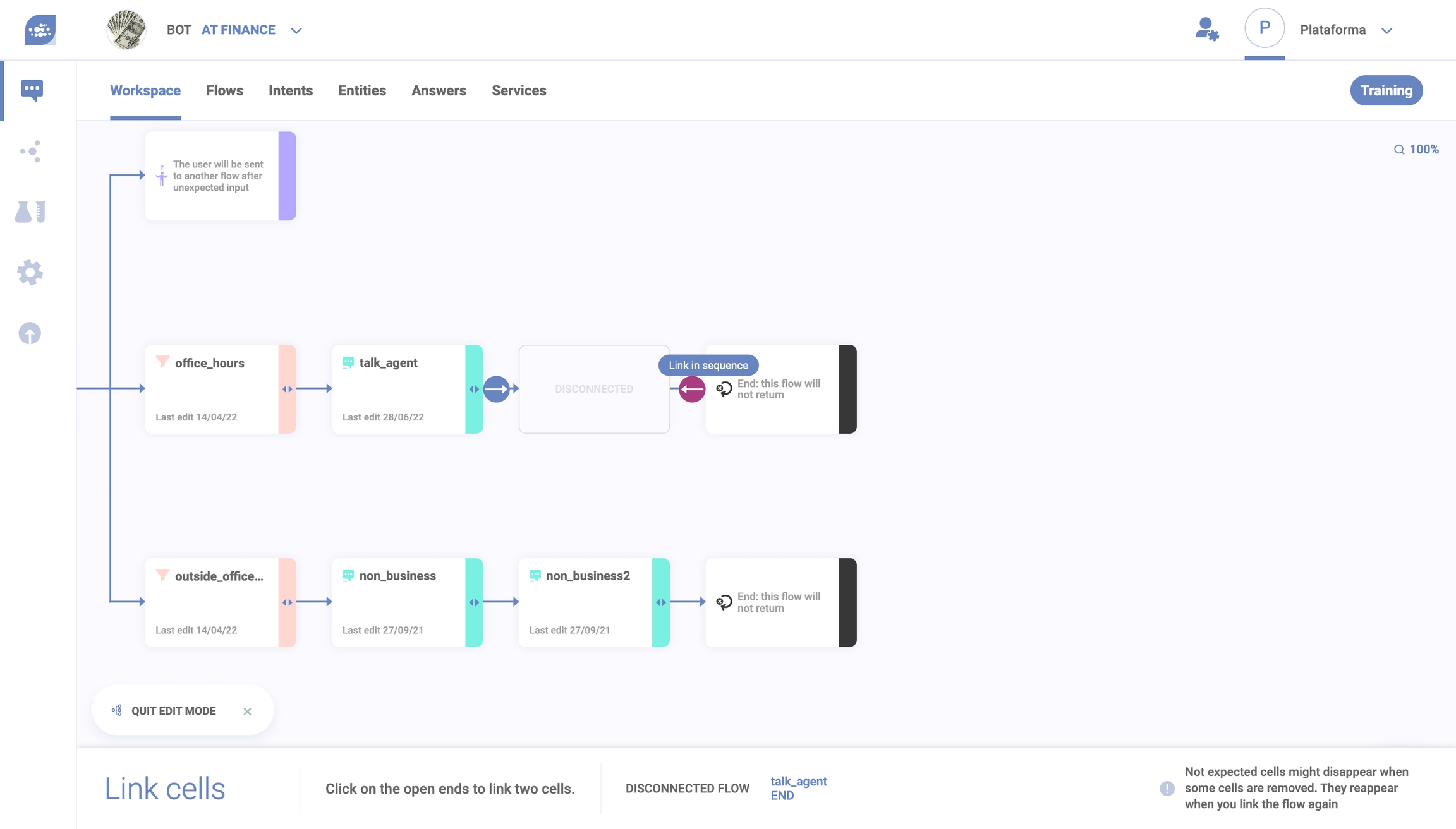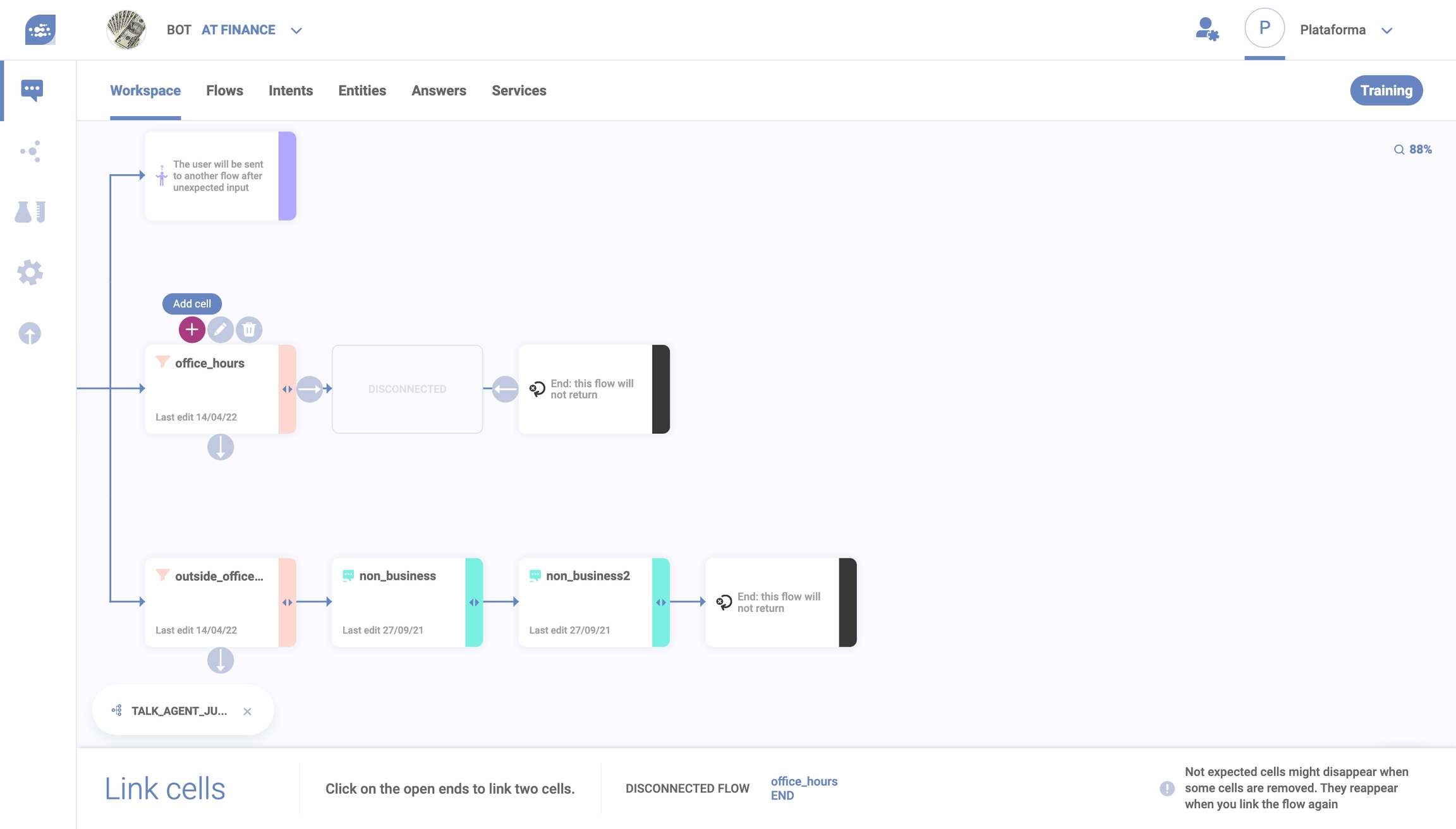 The not expected flow is a fallback answer (also known as idk) executed when the virtual agent doesn’t understand the user’s context. It works as a miniflow with one or more cells. It’s mandatory and cannot be deleted.