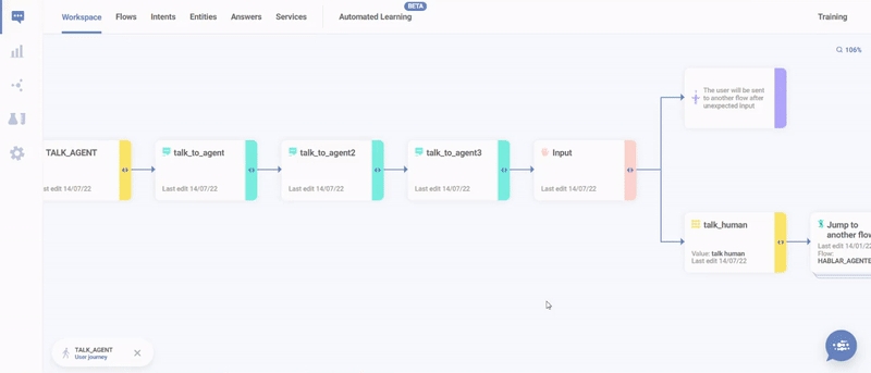 In the first case, an End cell was added after the "talk_agent" answer cell. If users follow this route, the flow stops there. Whereas, if they go through the other path, they will go back to the origin flow.
