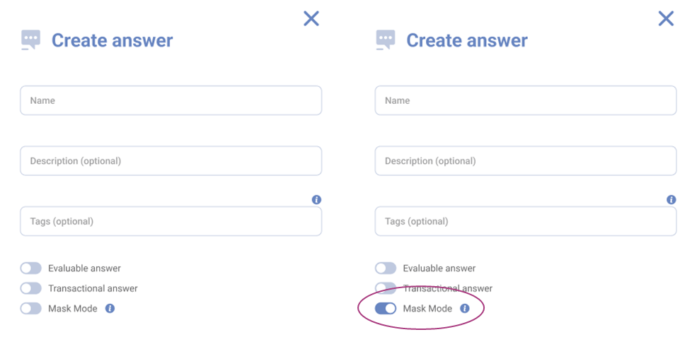 For the virtual agent responses, you can flag answers that need to be masked using the technical field. Additionally, a button will be available to mask transactional answers, with specific provisions for Voice Gateway interactions. In the case of audio inputs requiring masking, a prior indication is necessary to inform users that the next input must be masked, ensuring that no user input records are left unprotected.