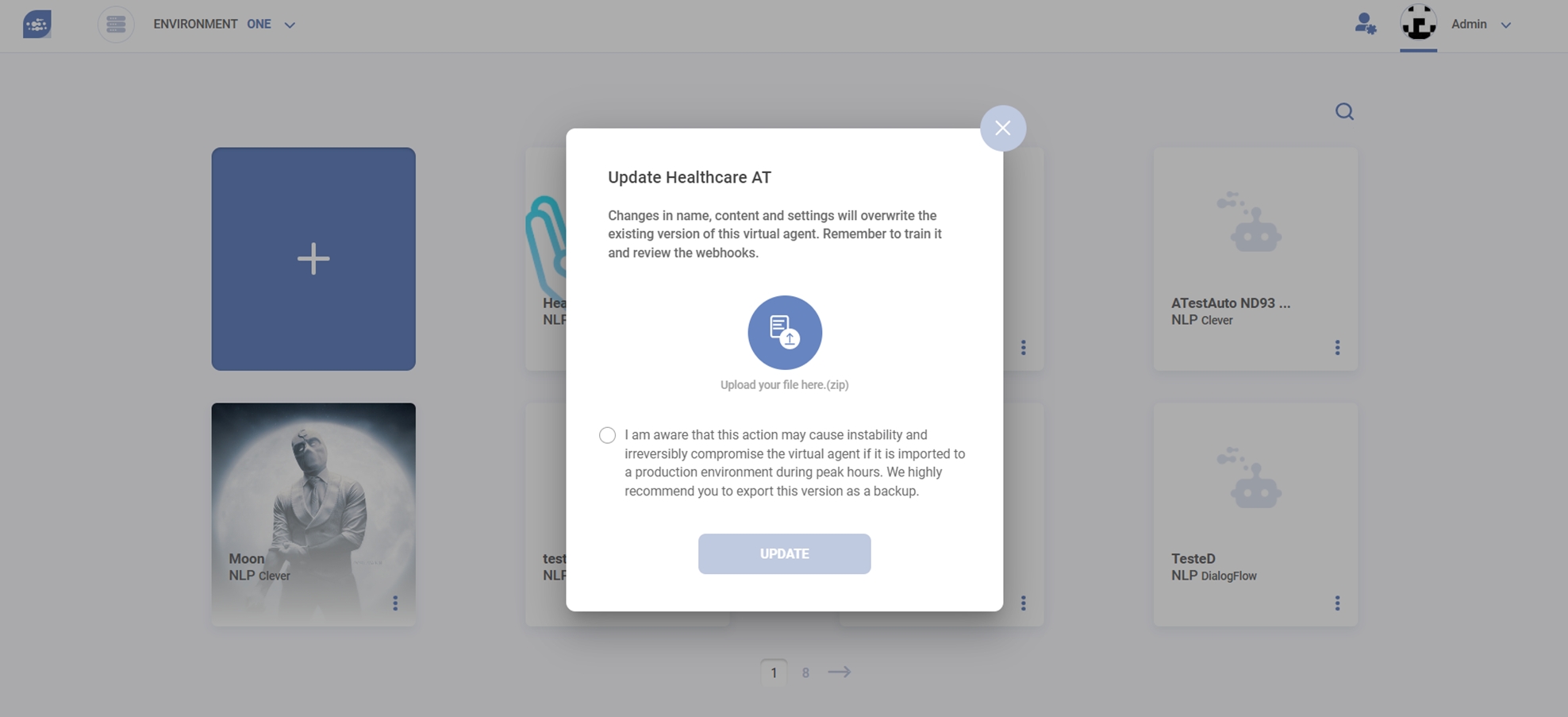 Once in the Cockpit, access the popup menu of the virtual agent you want to update. Click the “Update” option on the popup menu at the main page.