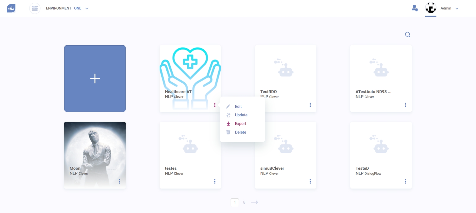 This feature allows you to export a virtual agent as a ZIP file for backup or to update a version in another environment. To export the virtual agent, click the “Export” option on the popup menu at the main page.