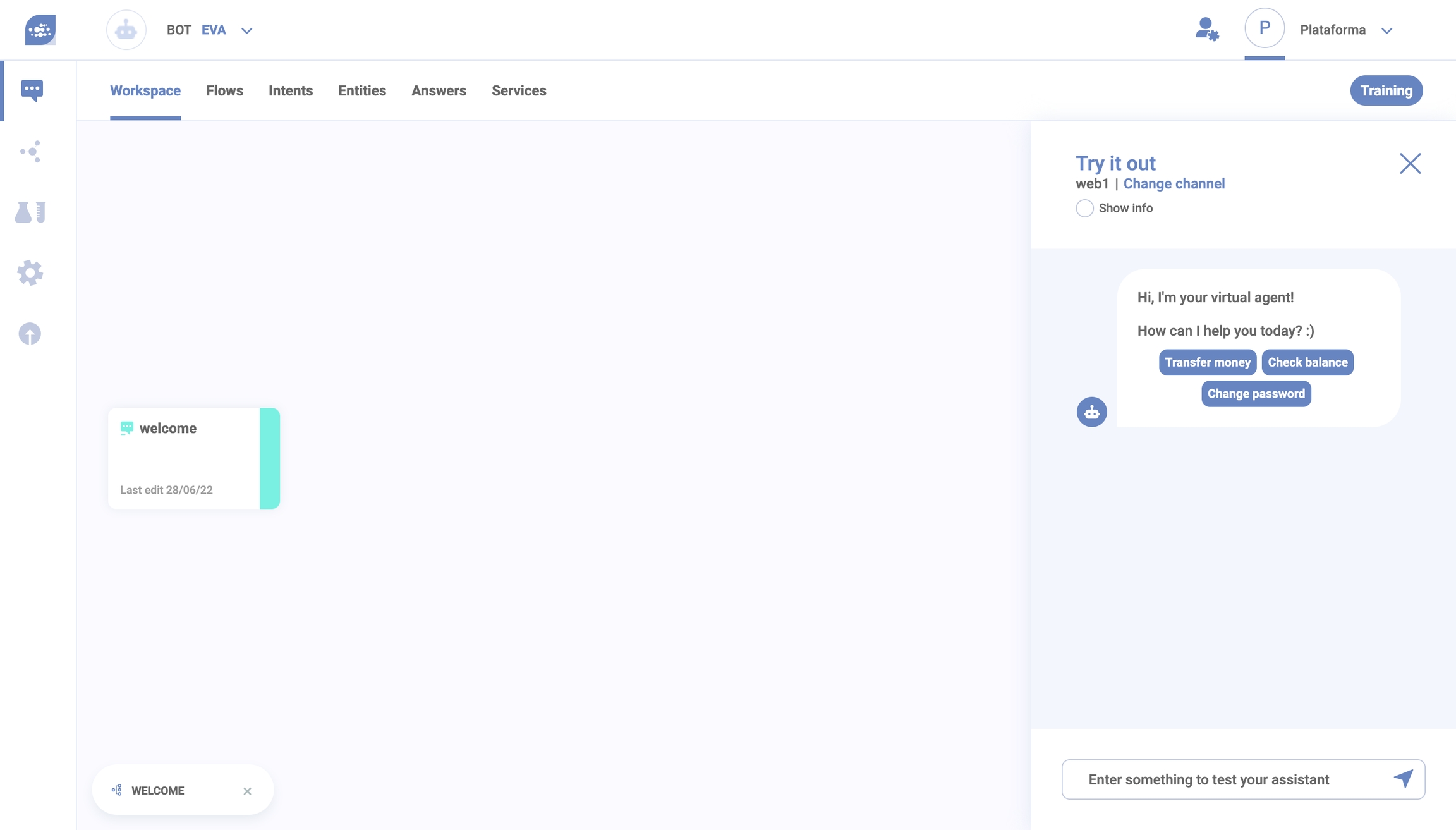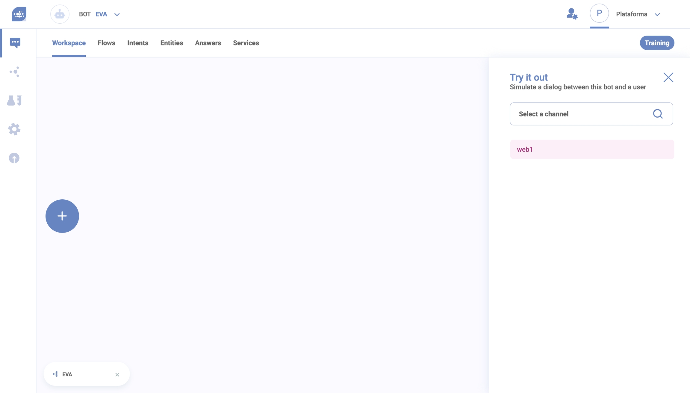 After you train your intents in Syntphony NLP (or use the ones from other NLPs), you can see how your dialogues will work in a simulated chat. The dialog simulator allows you to test your virtual agent by checking if its intents, entities, services and other cells are behaving properly. To access the simulator, click the balloon button in the bottom right corner.